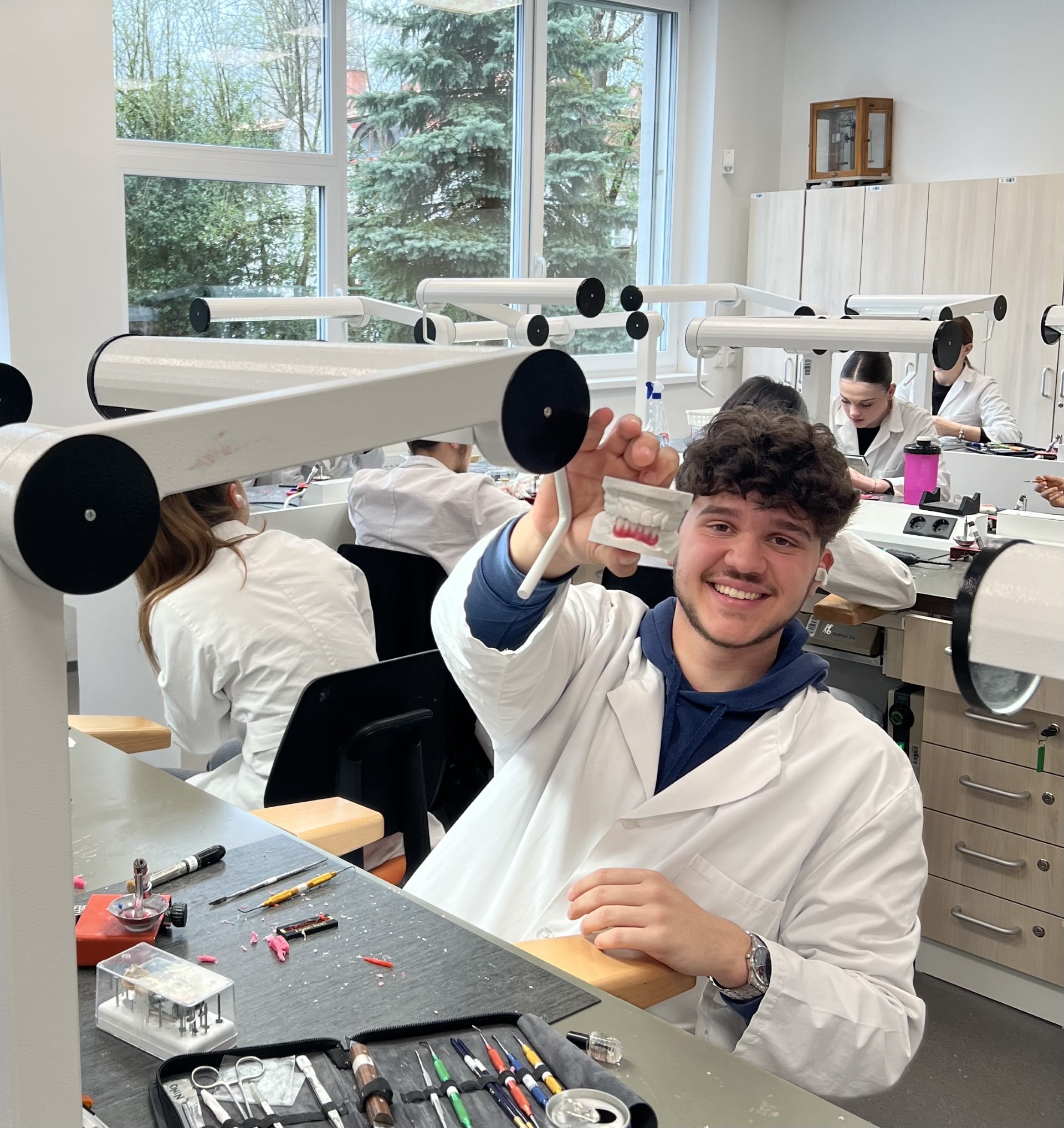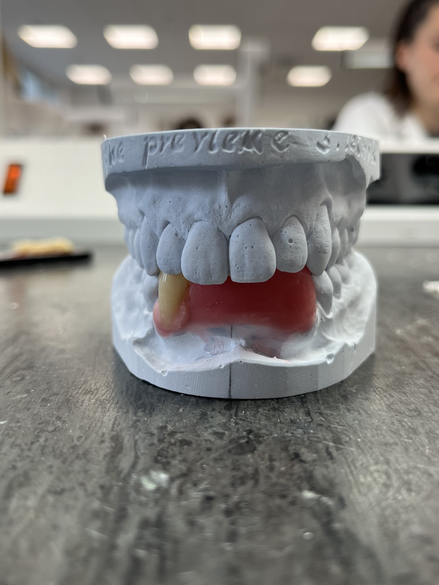 V četrtek, 28. 3. 2024, smo imeli dijaki 3. Za razreda projektni dan. Naša naloga je bila postavitev zob. Na spodnjem mavčnem modelu smo obrusili zobe interkaninega področja in na to mesto namestili grizni robnik. Ko smo preverili naklon in višino griznega robnika, ki smo jo preverjali z antagonisti ter prenesli mediano linijo, smo pričeli s postavitvijo zob. Zobe smo lahko postavili individualno iregularno ali biogeno ter za zaključek zmodelirali še obzobna tkiva – dlesen.
